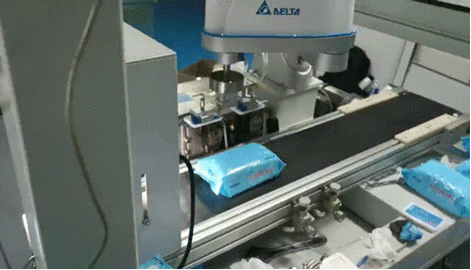 台达充分利用SCARA工业机器的同步追踪、自动规划运动轨迹功能,搭配机器视觉系统强大的视觉监测算法,在传送带运行过程中实时捕捉湿巾盖位置,依次完成定位、抓取、涂胶与贴合作业,实现真正的在线追随作业,大幅缩短生产时间。