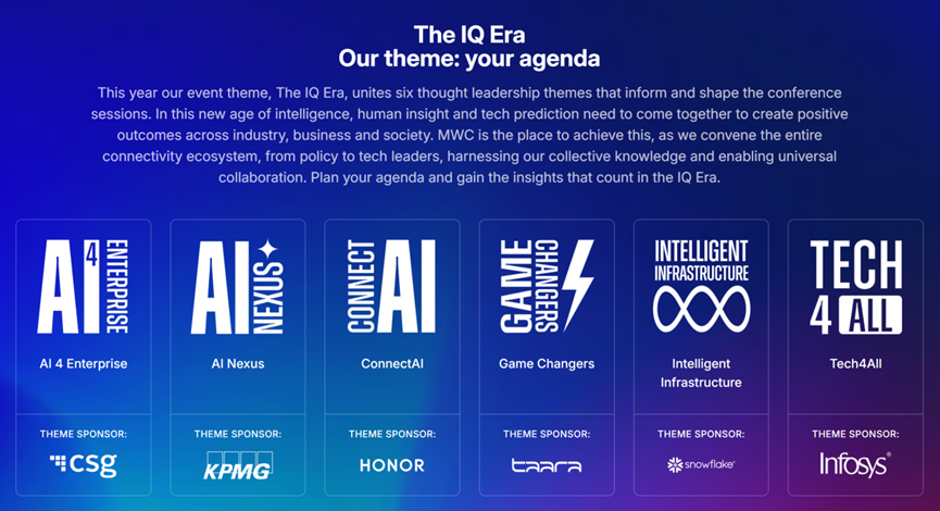 除了各种围绕移动通信网络的展示和研讨,MWC 26还如上图所示以“智能世纪(The IQ Era)”为主题设立了六大与AI相关的板块,覆盖企业级AI、AI连接技术、智能基础设施、AI生态整合、AI科技普惠和颠覆性创新。可见AI已经成为MWC这个ICT领域内最重要的展会的另一个重要话题,正如本文开篇所述,MWC 26在CES 2026之后延续了AI话题,国内厂商也将带来各种智能终端使物理AI的天下不断扩大,并成为其重要推动者和见证力量。