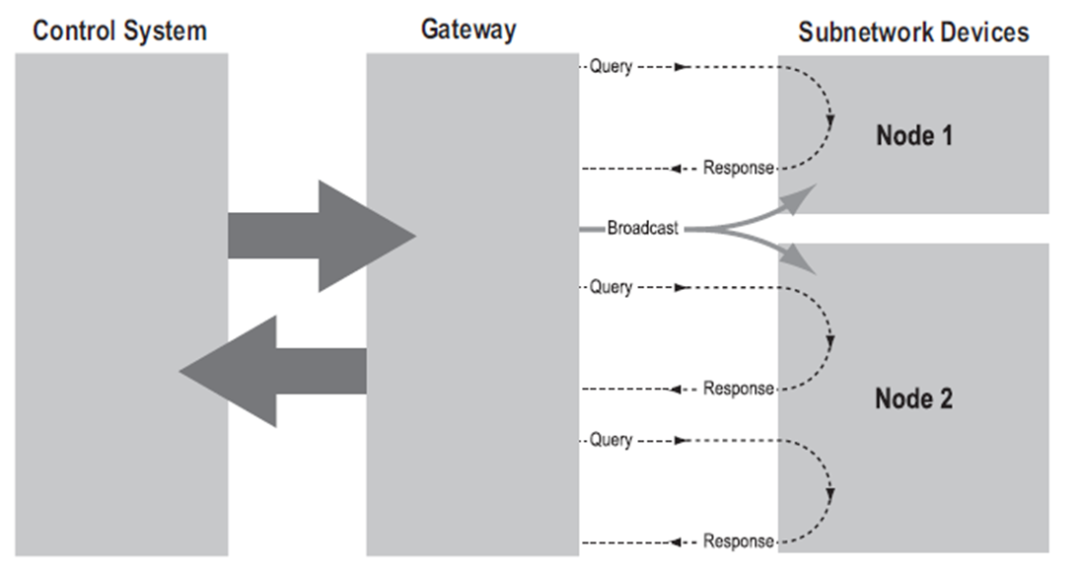 请求响应式:即两个设备间的一次通信过程必须以一方发起请求(Query)开始,另一方在规定时间内做出正确响应(Response)为终止,典型的如 Modbus RTU,通信具有明确目标,请求者与响应者一对一通信。