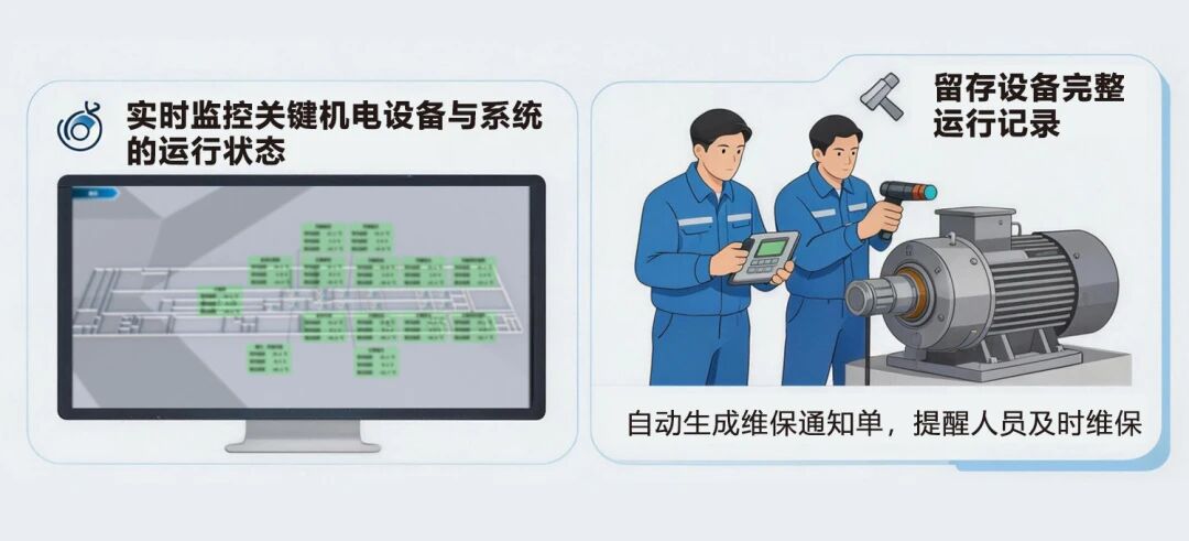 系统留存设备完整运行记录,自动生成维保通知单,提醒人员及时维保,延长设备寿命、降低运行成本。