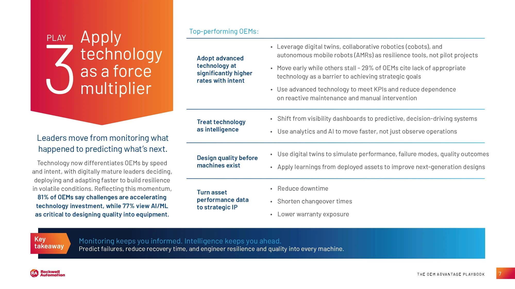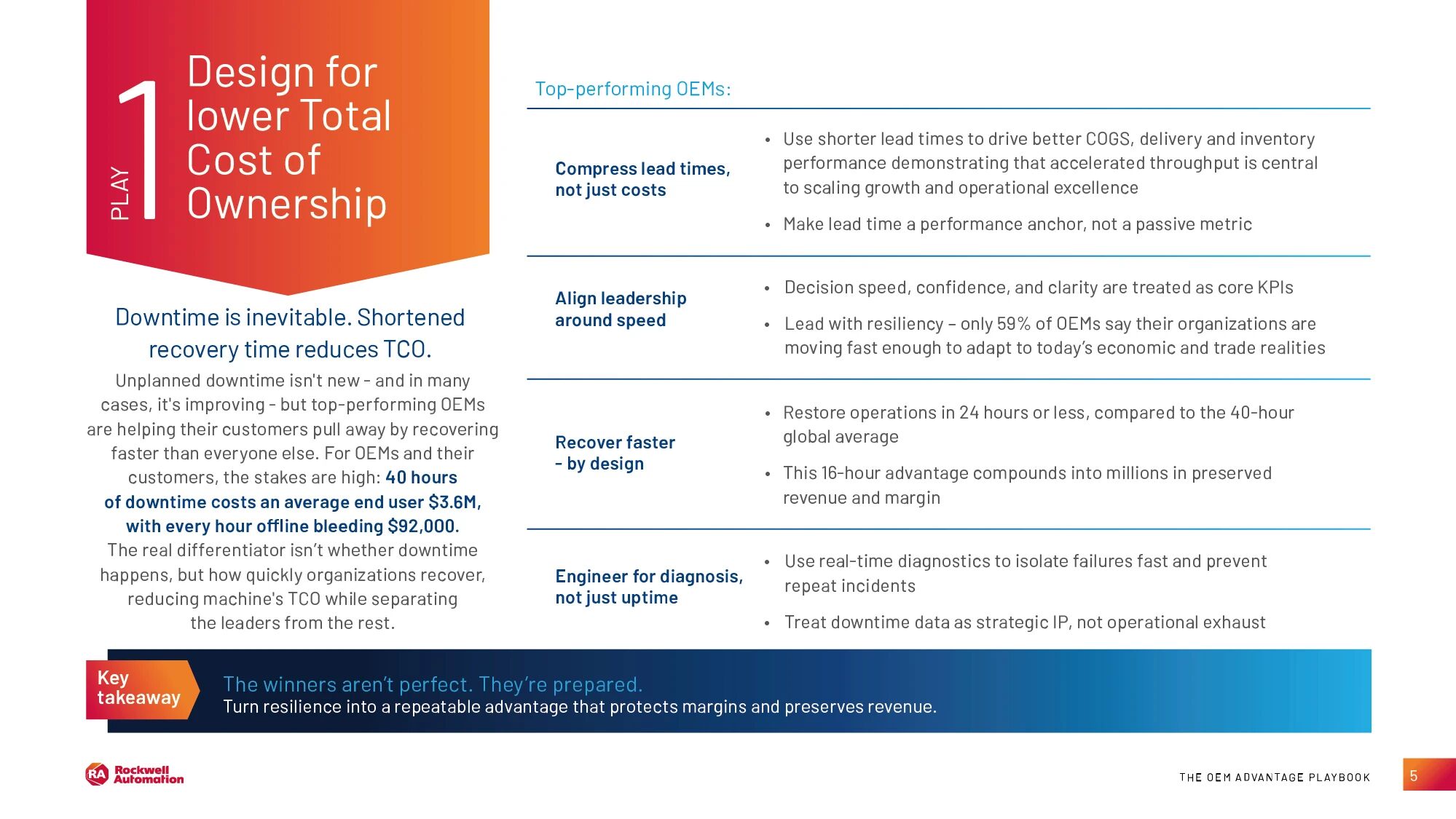 这项名为 OEM Advantage Playbook 的调研共覆盖来自 17 个国家和地区的 500 位 OEM 企业高管。研究表明,OEM 正持续应对劳动力不稳定、供应链波动、成本压力和客户期望上升等挑战。因此,许多企业正在调整其运营方式,以便在充满不确定性的环境中维持稳定的绩效表现。这些表现领先的 OEM 不再仅仅依赖机器性能,而是专注于更快的恢复能力、运营稳定性,以及基于数据的决策。