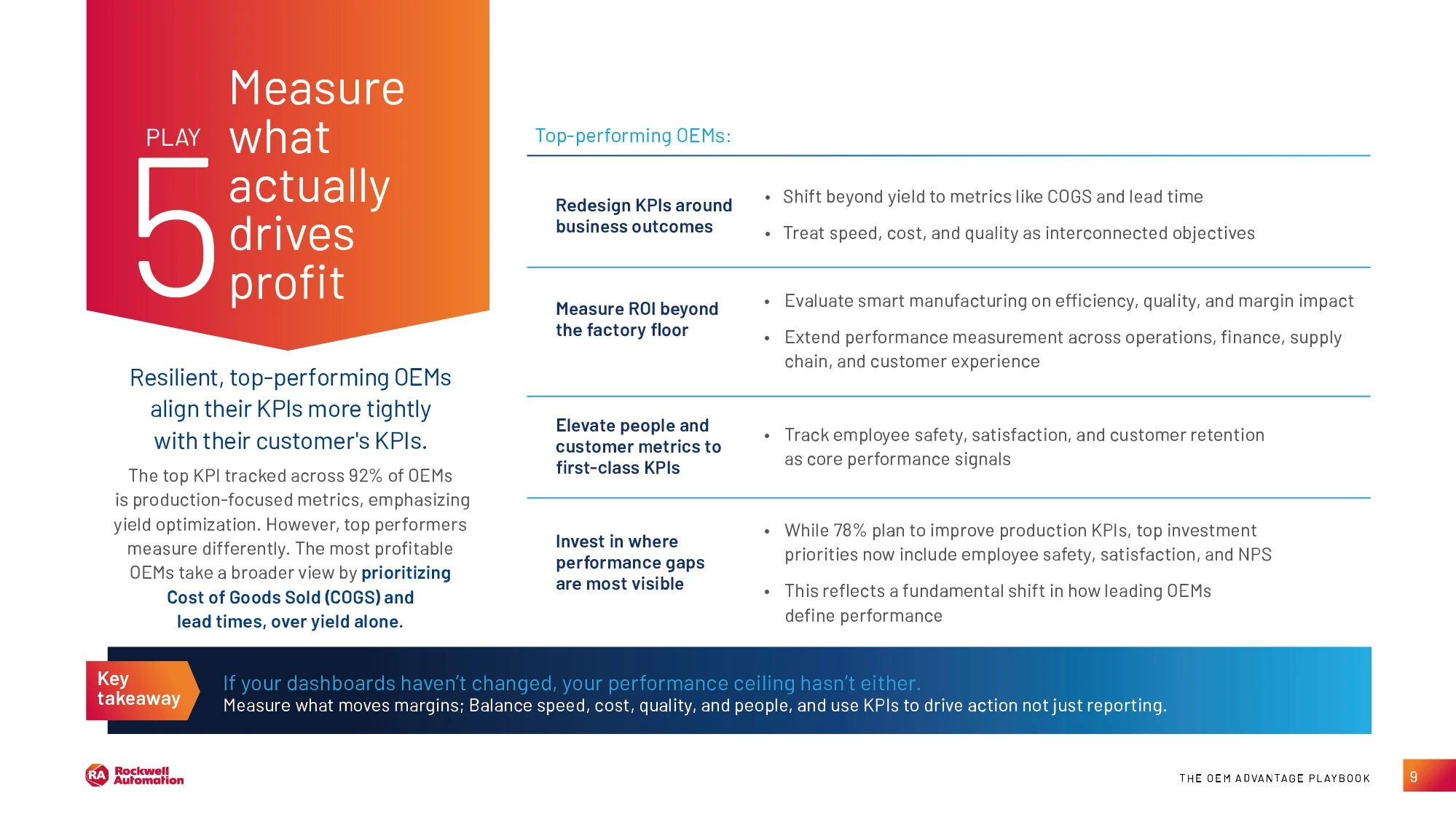绩效表现优异的 OEM 不再仅关注传统生产良率,而是将安全、满意度等新兴的以人为本指标纳入评估体系,同时会重点考量盈利能力和客户绩效指标,包括销售成本、交货周期、停机恢复时间等。