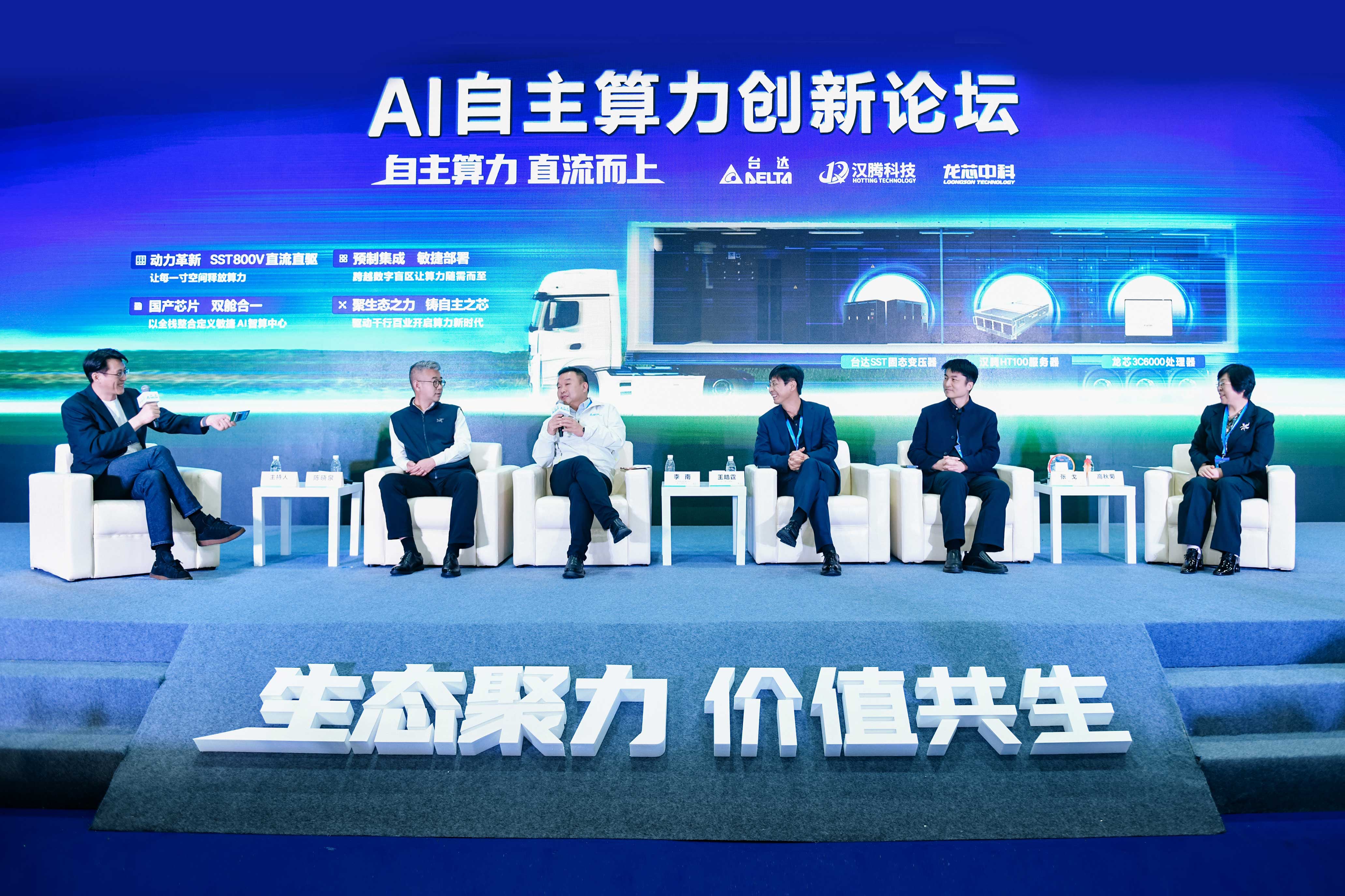 汉腾科技董事长王皓霆从算力硬件层面阐述了合作价值:“汉腾科技联合台达、龙芯中科打造的集装箱式SST直流移动智算中心,实现了从能源到计算的全栈协同与自主可控,核心价值体现在三大方面。以台达SST固态变压器为能源核心,实现10kV交流直降800V直流,转换效率高达98.5%,将PUE降至1.15,体积缩减50%,为高密度边缘算力筑牢高效紧凑的供电底座。搭载龙芯3C6000国产CPU与太初、登临、天数等AI加速卡,经深度联合调试,打造完全自主的计算核心,保障服务器满载工况下稳定运行,筑牢算力安全防线。汉腾科技负责整机与成套设备一体化集成,严苛把控品质与调试环节,兼顾产品的高可靠性与快速部署能力。全链路硬件协同打破地域部署局限,结合灵活的算力节点调度能力与AI智能体应用,可实现边缘算力动态调配、智能运维与场景化算力响应需求,为各类边缘场景提供可移动、高安全、自适应的一站式算力解决方案。”