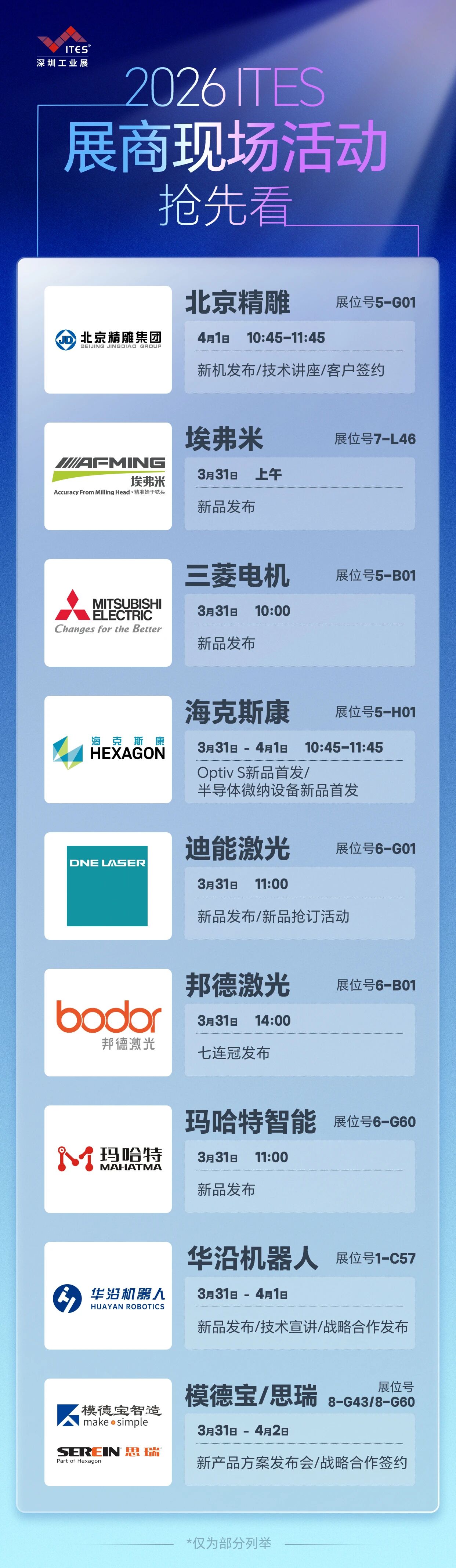 每年开春,逾百项“全球首发、中国/华南首展”的创新成果在ITES重磅亮相!从智能核心装备到颠覆性工艺新成果,可全面满足通用加工的高效生产目标,以及半导体、新能源汽车、AI服务器、医疗器械和商业航天等热门赛道的定制化加工需求。
