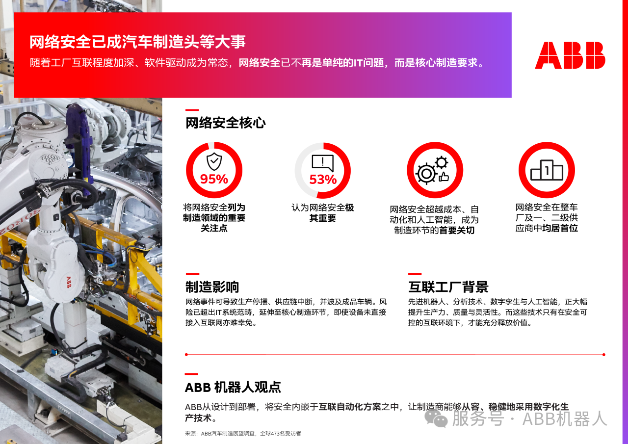 网络安全已不再是汽车制造商未来需要考虑的议题,而是当下在生产核心环节必须应对的问题。随着工厂互联程度、软件驱动性和数据密集度不断提升,网络安全已成为一项核心制造准则。数十年来,ABB始终将安全理念融入企业文化并贯彻于智能互联自动化平台的设计之中,助力客户稳健推进数字化制造转型。