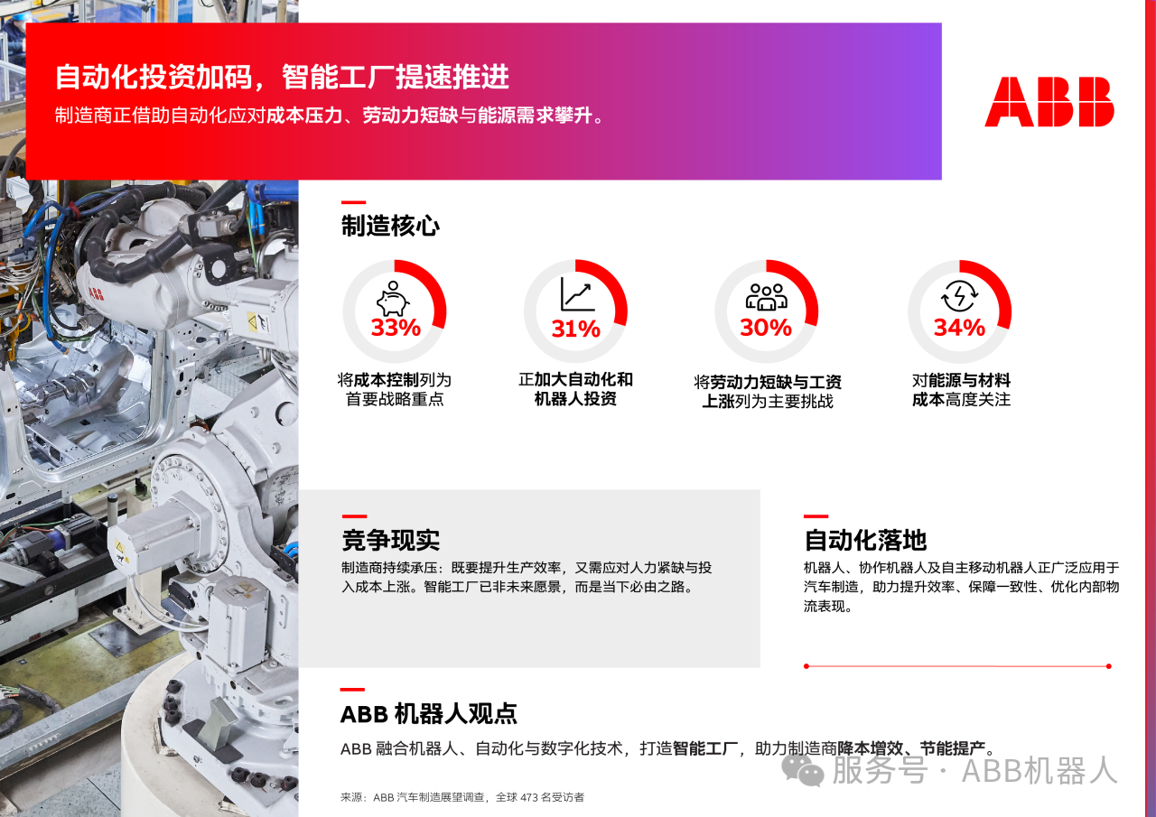 汽车制造商及主要供应链企业正加快机器人与自动化投资,以保持竞争力、控制成本、应对持续的劳动力与能源压力。
