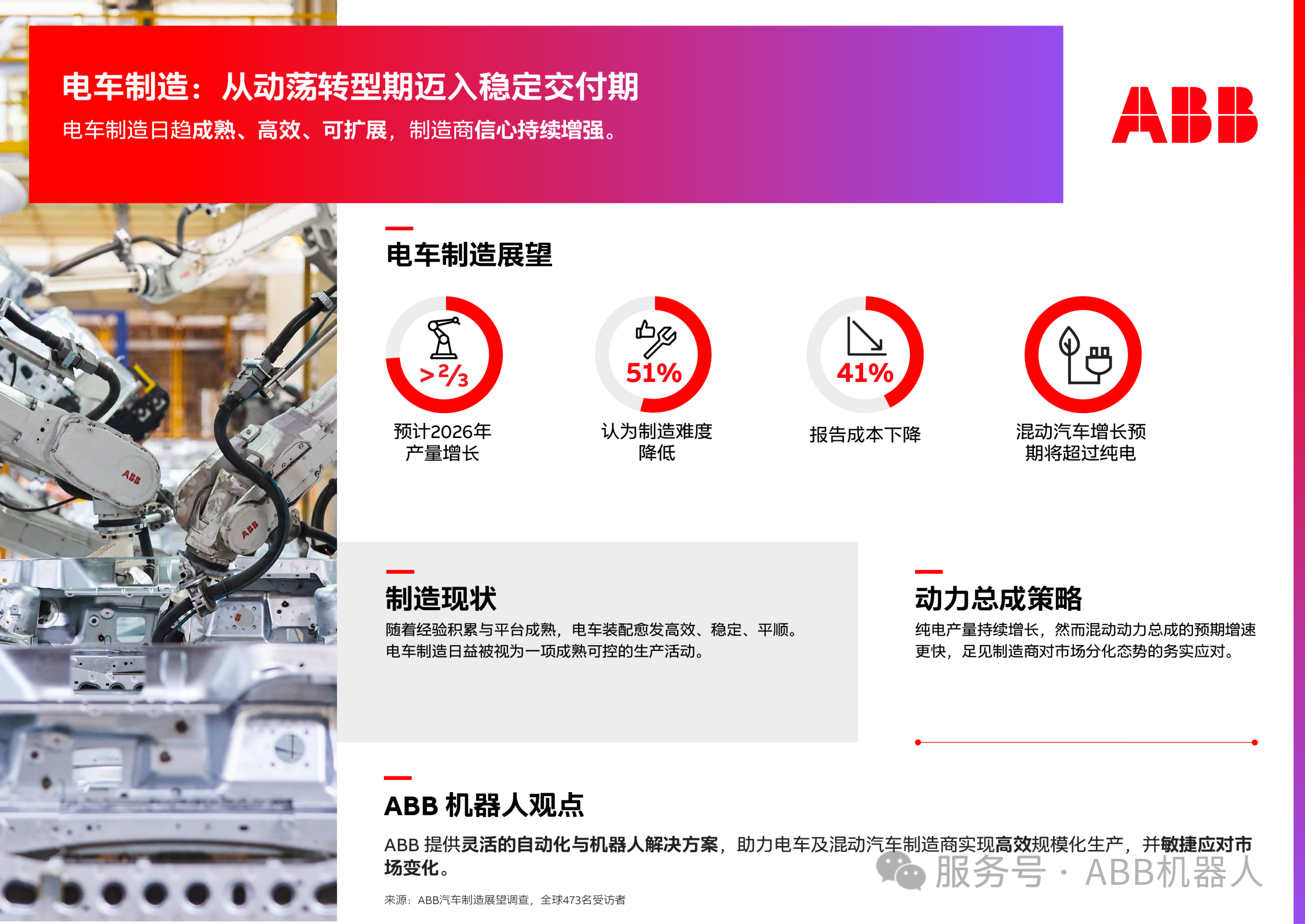 近日,ABB 机器人与汽车行业权威期刊《汽车制造解决方案》再度携手,正式发布第四次汽车制造行业前景调查。继去年调查揭示行业对电动汽车生产目标的关键洞察之后,本次调查进一步聚焦当前阶段的核心变化,为整车企业及零部件供应商把握制造转型新方向提供了有力依据。