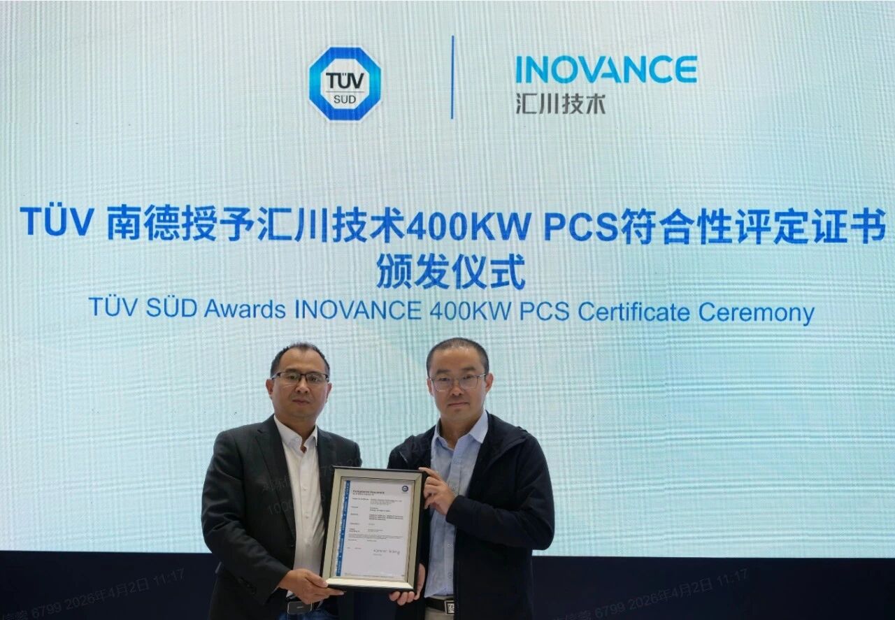 4月2日,在第十四届储能国际峰会暨展览会上,TÜV南德意志集团(以下简称“TÜV南德”)正式向苏州汇川技术有限公司(以下简称“汇川技术”)颁发证书。汇川技术400kW储能变流器成功斩获三项符合性评定证书,涵盖电气安全(CE LVD)、欧洲并网(EN 50549系列)及比利时并网(C10/11) 三大领域。