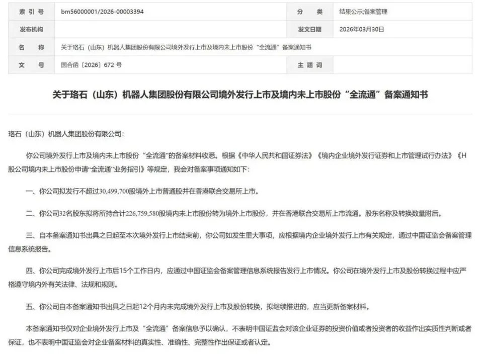 3月30日,中国证监会官方网站发布公示信息,珞石(山东)机器人集团股份有限公司(下称“珞石机器人”)境外发行上市及境内未上市股份“全流通”事项已完成证监会备案,拿到赴香港联合交易所主板上市的监管备案通知书。