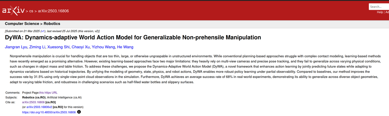 这一方向如今已成为具身智能领域的研究热点,但早在 2025 年 3 月,银河通用发表了 DyWA: Dynamics-adaptive World Action Model, 在全球范围内首次对 WAM 的概念进行结构化定义,并在接触动力学复杂的任务实现了成功的验证。