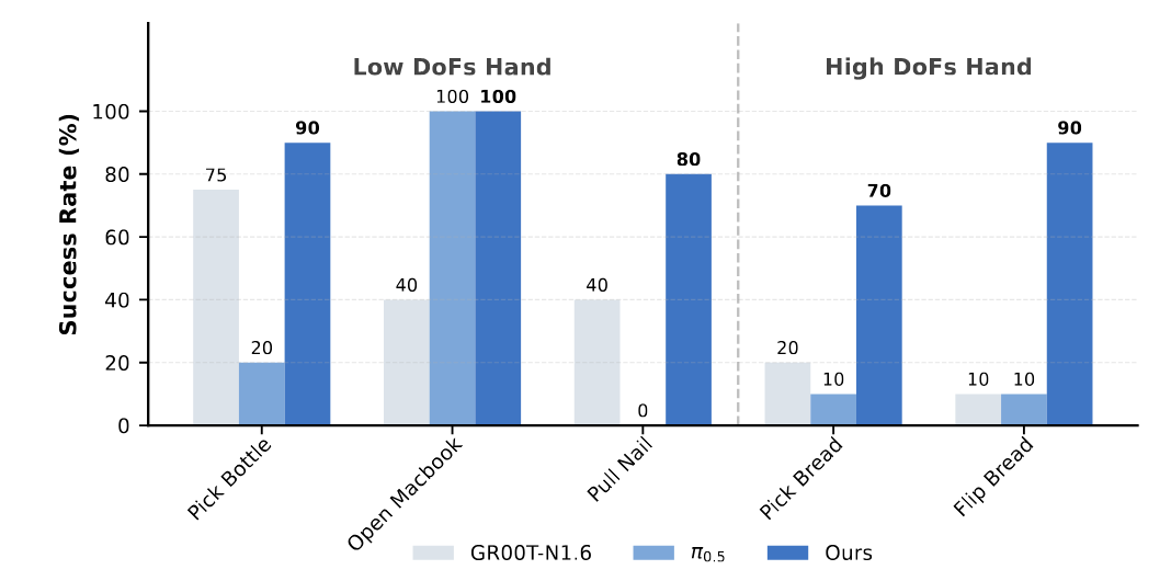 GROOT-N1.6、π0.5、LDA 三项工作在具体任务中使用灵巧手操作的成功率对比