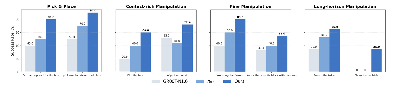 超强真机表现:跨本体、少样本、长程灵巧操作