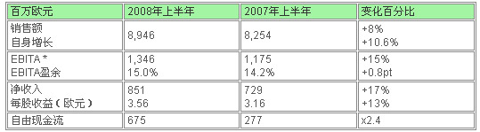 在2008年上半年,尽管有成本方面的通胀压力以及不利的汇率形势,自身产量增长、价格上升以及生产率还是共同推动了业绩的显著提高。EBITA提高15%,达到13.46亿欧元。