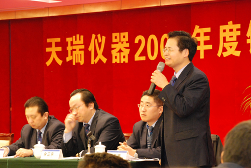 12月24日,天瑞仪器2008年度销售大会在昆山市华东国际酒店三楼多功能厅隆重召开,来自全国30多个省市区的200多名经理级销售人员参加了会议。会议由销售总监(南)严卫南主持。董事长刘召贵博士、总经理应刚、副总经理王耀斌、副总经理胡晓斌、副总经理兼北京邦鑫伟业技术开发有限公司经理余正东等领导出席了会议。