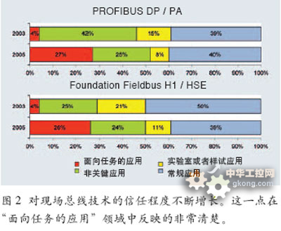 在问到用户对哪一种现场总线系统使用情况下更加信任时,得出的结论多少有些出人意料。在2003年时还只有很少的一部分用户,大约占4%左右,在面向任务的使用条件下对Profibus现场总线比较信任,今天这一比例已增加到了27%(图2)。