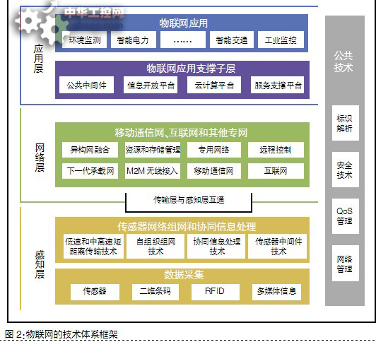 物联网的技术体系框架如图2所示,它包括感知层技术、网络层技术、应用层技术和公共技术。