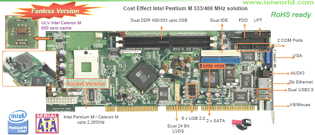 PICMG 1.0 全长卡,Socket 479 接口,支持Intel® Pentium®M/Celeron®M FSB533/400Mhz CPU Card ,带有 VGA,LVDS, GbE, Audio and SATA接口 |