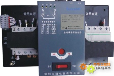 1.1 产品简介 BKQ1系列自动转换开关是我公司利用微机控制技术开发研制的新一代自动转换开关。该开关以深圳宝凯电器有限公司的BKZ系列、BKM系列断路器或负荷开关为执行元件,并配以机电一体化、带机电双重联锁的新型控制机构,特别适合用在不容许电源断电的重要供电场所。为满足现场需求,自动转换开关可实现自投自复、自投不自复、互为备用三种不同的工作方式。 1.2 产品主要特点 ■三种可选工作方式 ◎自投自复工作方式 ◎互为备用工作方式 ◎自投不自复工作方式 ■三种稳定工作位置 ◎ 常用电源合、备用电源分 ◎ 常用电源分、备用电源合 ◎ 常用电源分、备用电源分 ■ 体积小、结构简单、外形美观、具备 LA-630A 规格,操作方便、使用命长,2极、3极、4极开关均可提供。 ■ 开关切换驱动采用单电机驱动,结构简单,切换可靠平稳、无噪音、冲击力小。 ■ 开关带有机电联锁保护,确保两路电源可靠工作,互不干涉。 ■ 开关能带负载自动切换,紧急时可采用手柄进行手动切换。 ■ 与其它公司同类产品相比的特色 ◎控制器保护熔断器分断能力为 50KA, 提高了配电安全。 ◎ 在手动与自动运行方式问加有联锁,保证自动情况下不可手动操作。 ◎ 执行断路器手柄折断、触头粘接或负载故障 (过载、短路) 时自动转换开关不切换,真正实现机电联锁。 ◎ MCB型自动转换开关驱动机构擒纵由又型改为凹型,解决了MCB加长手柄断裂、MCB闭合不同步等故障,恢复了MCB速合、速断的功能,有 效提高了产品机械寿命。 ◎ 提供按错线保护,当用户将电源零线与火线接反时,通过声光进行 报警,提高了设备的可靠性。 BKQ1标准产品