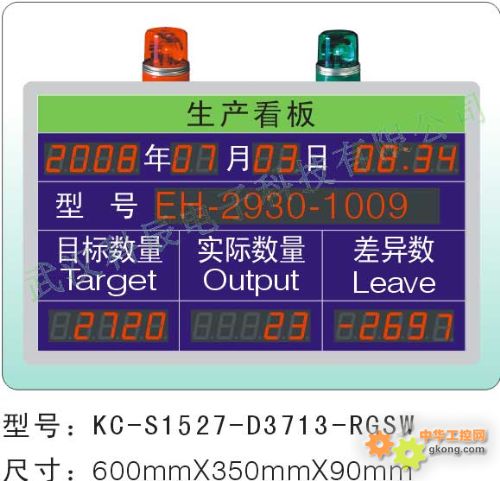 LED数字看板是专门为生产型企业设计的生产线看板,用于标示当天或当班的计划生产量、实际生产量、差异值、不良品、达成率、不良率等参数。其中计划生产量等可以由计算控制输入、遥控器或键盘输入,实际生产量,不良品等通过检测安装在生产线上的红外感应开关、行程开关等自动录入或通过按键录入,差异值、达成率、不良率等由看板内部的单片机计算并显示出来。LED数字管理看板的应用将有利于提高企业管理水平、降低企业的劳动力成本、激发员工的生产积极性等从而使企业获得更大的利润空间。