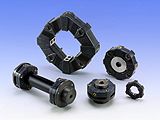 由富有弹性的橡胶传动。能出色地吸收振动和冲击,减少机械装置的噪音。弹性体的橡胶部分由多角形橡胶及填入其顶点的铝构成,各被坚固地硫化粘结在一起。将此橡胶体分别与圆筒衬套和法兰盘衬套用螺栓沿径向和轴向连接,通过橡胶体进行传动。特别是径向的螺栓连接,因是将预先变形的橡胶体与圆筒衬套连接,所以为预压缩结构,具有出色的柔性,可进行出色地吸收振动和冲击的传动。橡胶体有用螺栓固定安装在轴向上的O0 (O零) 型和不固定,利用插入安装用的S螺栓进行传动的S0 (S零) 型两种,可根据装卸要求选购。