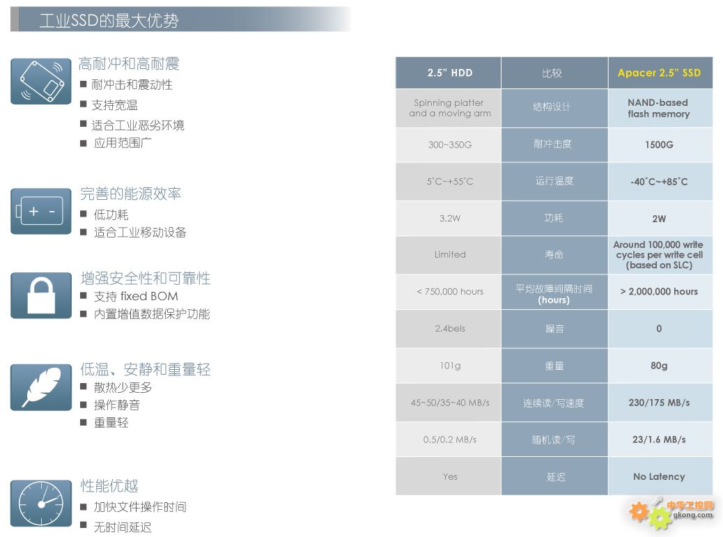2.5”硬盘的完美取代进阶平均读写算法功能与区块管理技术充分提高了SSD的使用寿命断电回复记忆功能支持ATA Secure Erase和SMART功能支持Trim CommandMLC 支持宽温(可选)