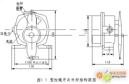 双向拉绳开关分Ⅰ型Ⅱ型两种型号,Ⅰ型动作后自动复位。Ⅱ型动作后有自锁装置(锁定销),需要手动拉出复位后开关才能重新使用。本件为双向动作,拉绳臂两端均可安装拉绳,当胶带机运行出现故障需要停机时,现场工作人员拉动拉绳,使转臂转过一定的角度,触动工作开关后能同时发出报警和停机两组信号,达到预防和控制设备及操作员安全的目的。