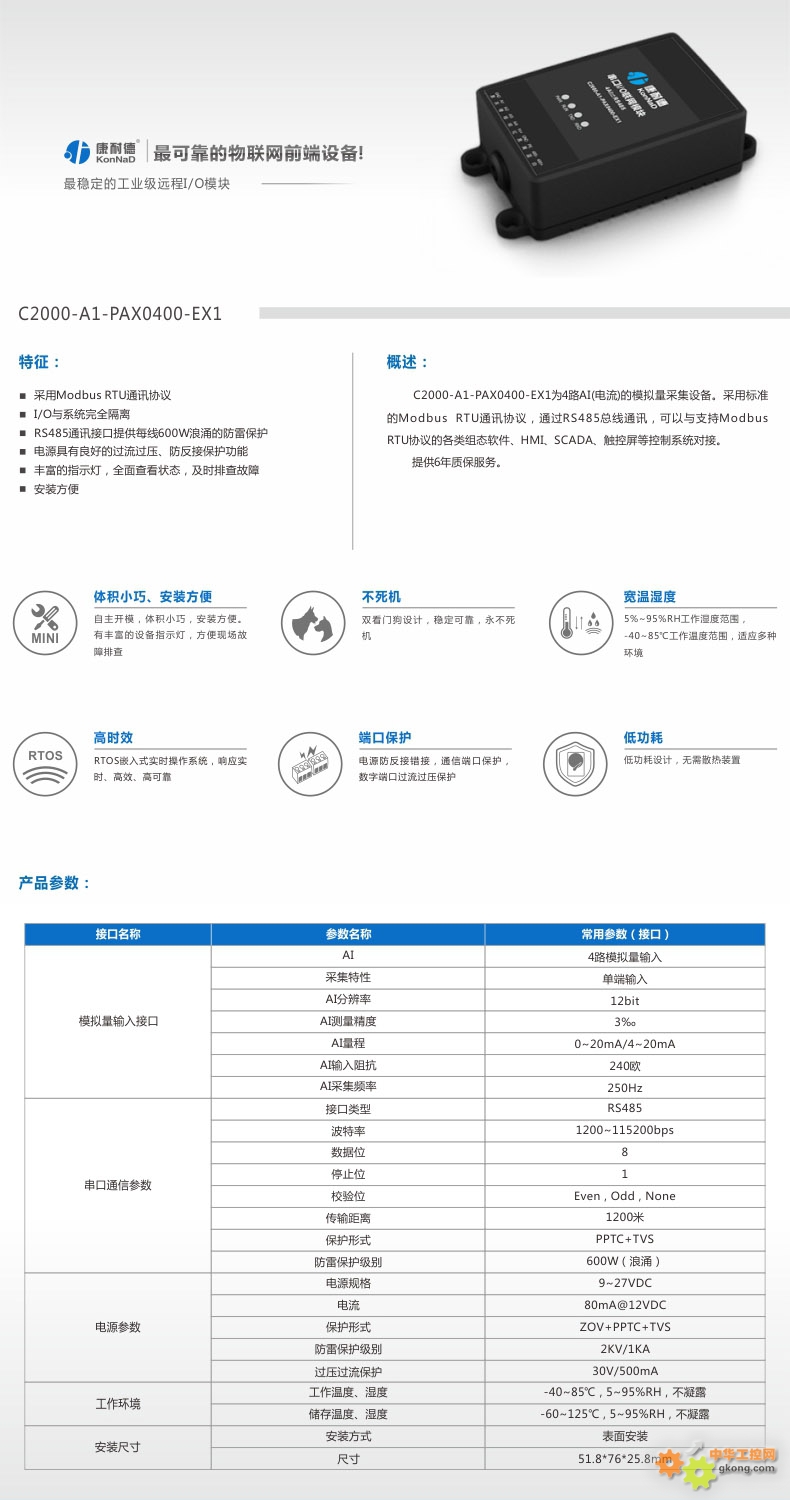 产品名称: C2000-A1-PAX0400-EX1(4路4-20mA转485)