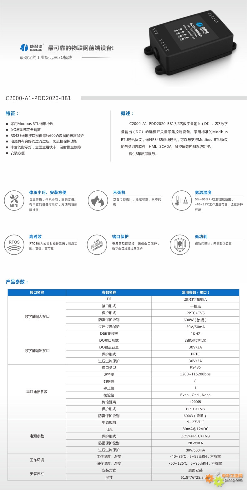 产品名称: C2000-A1-PDD2020-BB1(2路数字量输入输出模块Modbus RTU通讯协议)