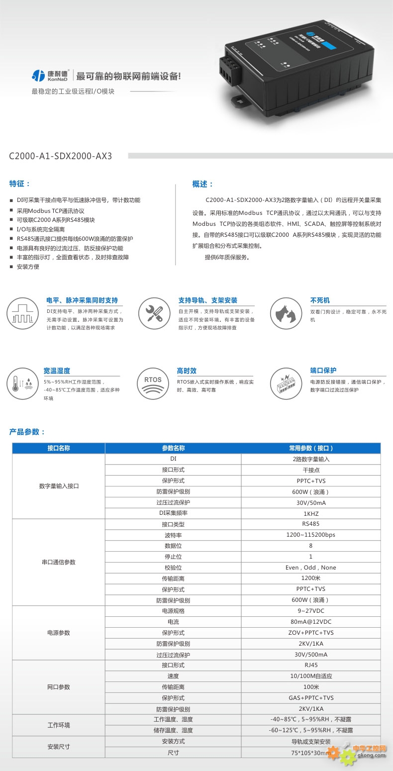 关 键 词: 2路数字量输入 可脉冲计数 开关量转以太网