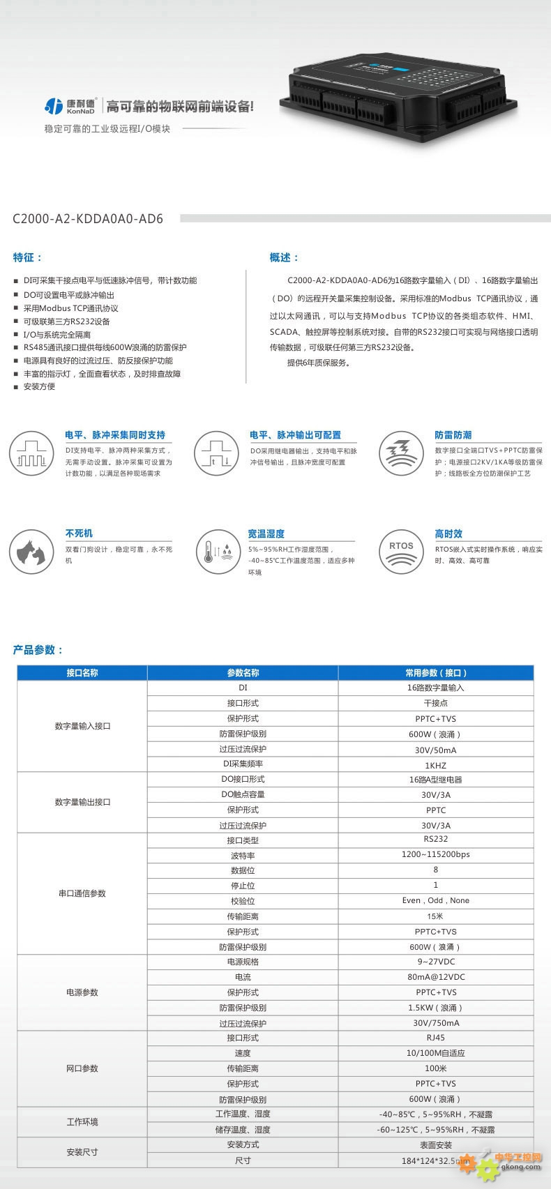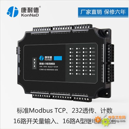 C2000-A2-KDDA0A0-AD6为16路数字量输入(DI)和16路数字量输出(DO)的智能开关量联网采集模块,DO为16路继电器输出,采用标准的Modbus TCP通讯协议,可以通过TCP/IP网络远程采集开关量数据。 提供6年质保服务。