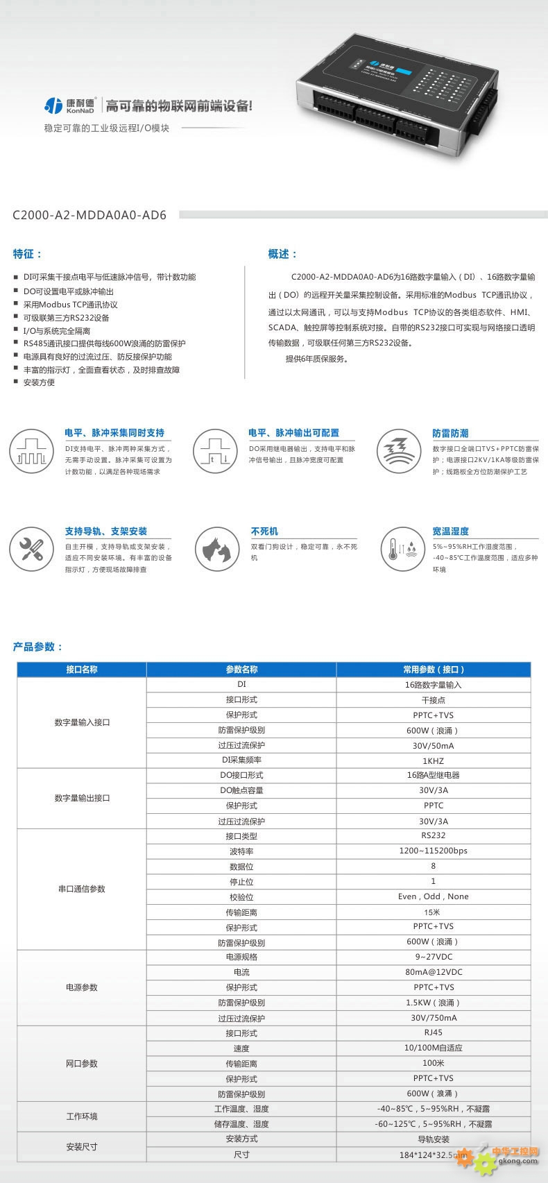 C2000-A2-MDDA0A0-AD6是数字量网络输入输出模块,其具备良好的扩展性,可灵活地通过自带的RS485总线级联康耐德同系列串口I/O联网设备,以实现各种数字量、模拟量的组合、扩展采集的功能。