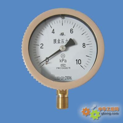 膜盒压力表采用膜盒作为测量微小压力的敏感元件。测量对铜合金不起腐蚀作用、无爆炸危险气体的微压和负压,广泛应用于锅炉通风、气体管道、燃烧装置等其他类似设备上。