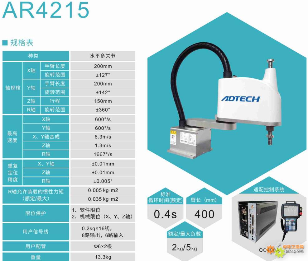 功能特性:AR系列机器人,结构精巧灵活,运行速度快、传动精度高、噪声小;配众为兴驱控一体控制器RC400,支持串口、网络、USB等多种通讯方式。具备多轴直 线插补,3D空间圆弧插补,轨迹跟随,平稳加减速,连续运动轨迹速度自适应功能、样条曲线教导,振动抑制等先进功能,使AR系列机器人满足SCARA机器 人各类应用场合。
