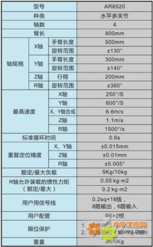 轴规格(X轴:手臂长度500mm,旋转范围 ±130°)(Y轴:手臂长度300mm,旋转范围 ±140°)(Z轴:行程 200mm) (R轴:旋转范围 ±360°)
