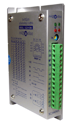 SC2440MA(B,C,D)是等角度恒力矩细分型高性能步进驱动器,驱动电压DC12-40V,采用单电源供电。适配电流在4.0A以下,外径42-86mm的各种型号的二相混合式步进电机。该驱动器内部采用双极恒流斩波方式,使电机噪音减小,电机运行更平稳;驱动电源电压的增加使得电机的高速性能和驱动能力大为提高;而步进脉冲停止超过100ms时,线圈电流自动减半,使驱动器的发热可减少50%,也使得电机的发热减少。用户在脉冲频率不高的时候使用低速高细分,使步进电机运转精度提高,最高可达200细分,振动减小,噪声降低。