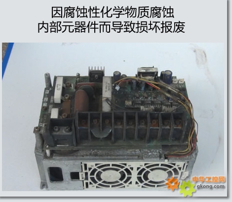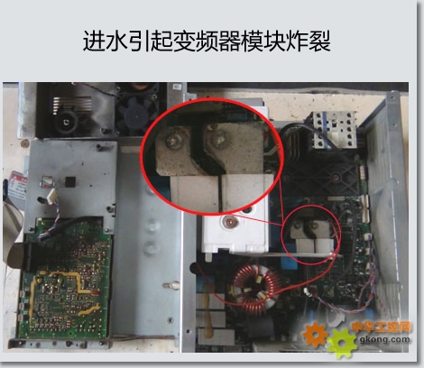 (3)造成端子间或各器件间受潮、霉变,绝缘下降,变频器开机时就短路炸机,无法修复,只能报废。