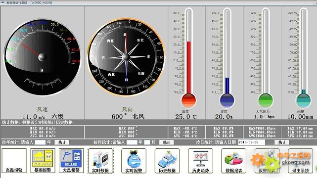 实时显示检测数据:风速、风向、温度、湿度、大气压力、雨量,并且可以根据设定时间统计历史数据。界面下方导航栏可切换不同的监控界面。