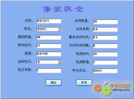 从上可以看到,包括投料延时、放料时间、放空限值、关门延时等参数都可以设置。这样可以根据不同的秤其物理特性的不同,实施不同的控制方案,从而提高控制精度。