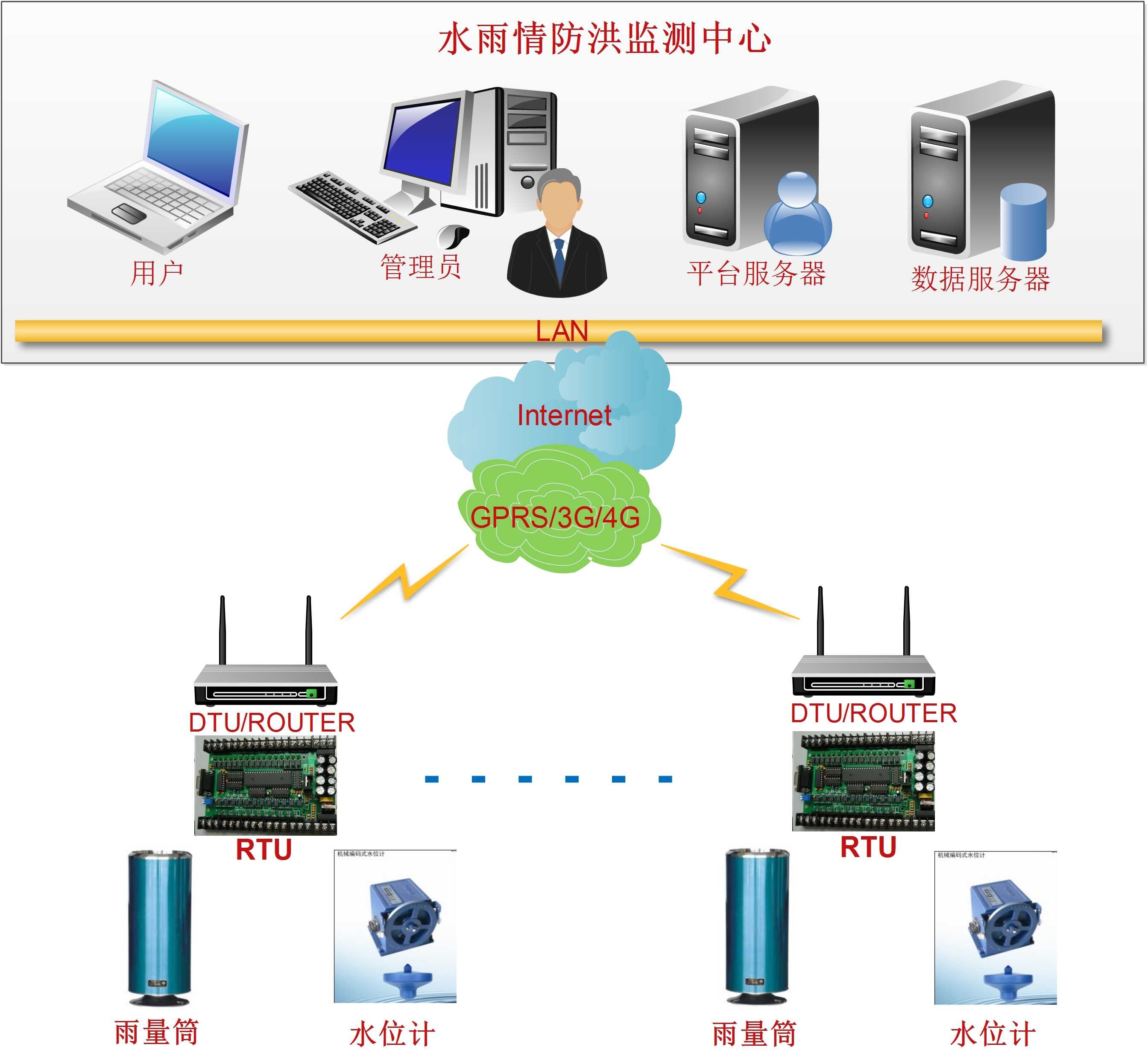 前端:由雨量、水文等传感器和RTU组成,RTU将水位、雨量等水雨情数据进行采集存储。