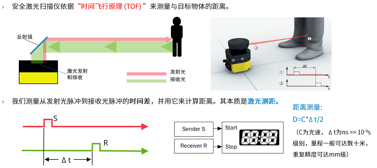 如下图所示,SICK 的安全激光扫描仪均为TOF原理,通过直接测量的距离数据,结合软件设置的2D区域,实现人员存在/闯入检测的作用。
