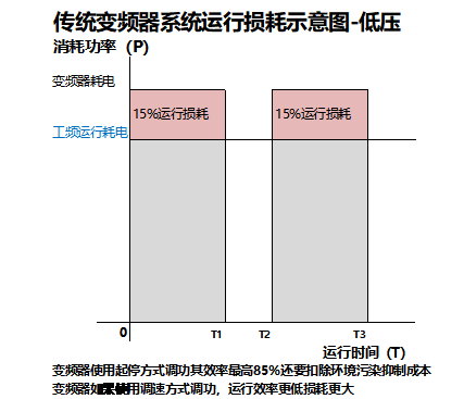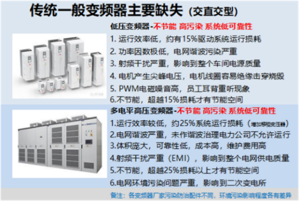 PWM变频器无法工频旁路运行导致严重缺失1.低效:低压运行损耗15%-高压25%,2.高污染:射频无线电干扰(EMI)、电磁辐射污染整个电网,3.电网谐波污染严重-进线变压器温升提高尖峰电流导致层间短路,4.功率因数恶化,5.整个车间自动化系统失灵误动作,6.电气设备仪表因谐波乱串而故障,7.电机铁损增加温升提高,8.尖峰电压导致电机线圈绝缘劣化,9.电磁噪音严重导致员工耳背重听,10.变频器效率低发热严重,11.产品可靠性低、维护成本高,12.低效高污染电气设备不符合国家绿色节能环保低碳法令要求。