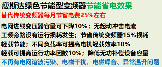 推荐使用瘦斯达绿色节能型变频器替代一般降压式软起动器解决以上缺失,瘦斯达适合不需要调速设备调功控制,调功效率达到99.99%。