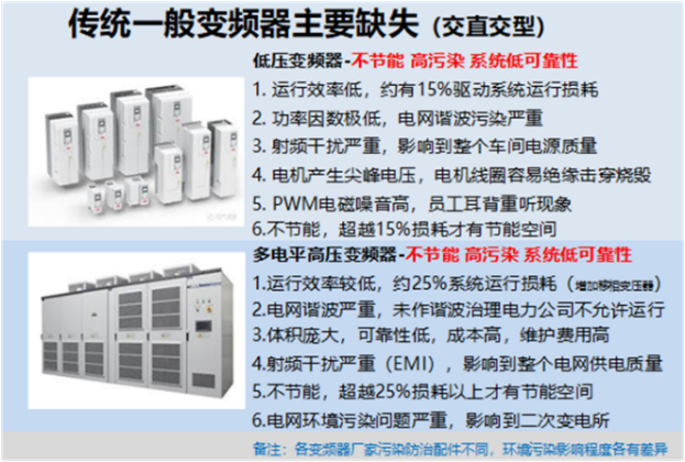 传统变频器无法工频旁路运行导致严重缺失1.低效:低压运行损耗15%-高压25%,2.高污染:射频无线电干扰(EMI)、电磁辐射污染整个电网,3.电网谐波污染严重-进线变压器温升提高尖峰电流导致层间短路,4.功率因数恶化,5.整个车间自动化系统失灵误动作,6.电气设备仪表因谐波乱串而故障,7.电机铁损增加温升提高,8.尖峰电压导致电机线圈绝缘劣化,9.电磁噪音严重导致员工耳背重听,10.变频器效率低发热严重,11.产品可靠性低、维护成本高,12.低效高污染电气设备不符合国家绿色节能环保低碳法令要求。