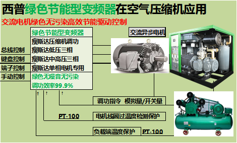 绿色节能型变频器有两种选择:瘦斯达控制电机软起停调整运行时间调功-适合一般不可调速压缩机;普司达控制电机软起停调整运行时间或变频调速调速调功控制-适合可调速或不可调速压缩机。