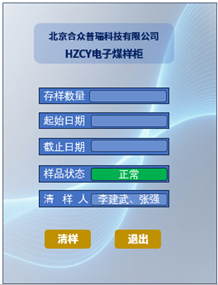 电子煤样柜在未存样时,处于初始状态,起始时间和截止时间是空的,第一次存样完成,点击退出后,将第一次存样日期在起始日期框中显示,起始日期在以后的操作中不做改变,作为本柜煤样保存开始日期;第一次存样完成后,截止日期框中显示第一次存样日期;在以后的存样操作中,依据存样时间进行改变。