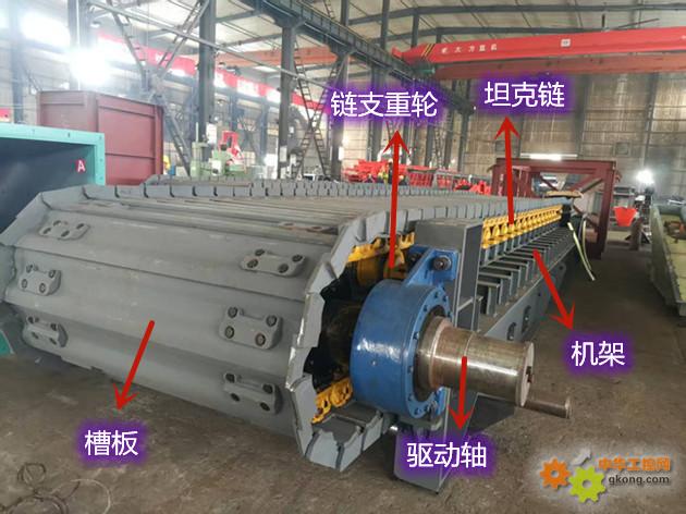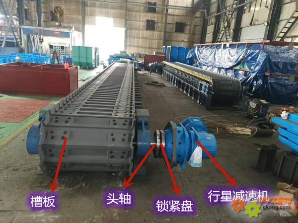 板式给料机传动装置的原理是电机的转速通过行星直交减速机降低速比后,通过和减速机空心轴套装的主轴的运转,把转速传输到链轮,链条和槽板上,带动槽板上的物料向前运动,起到匀速输送物料的作用