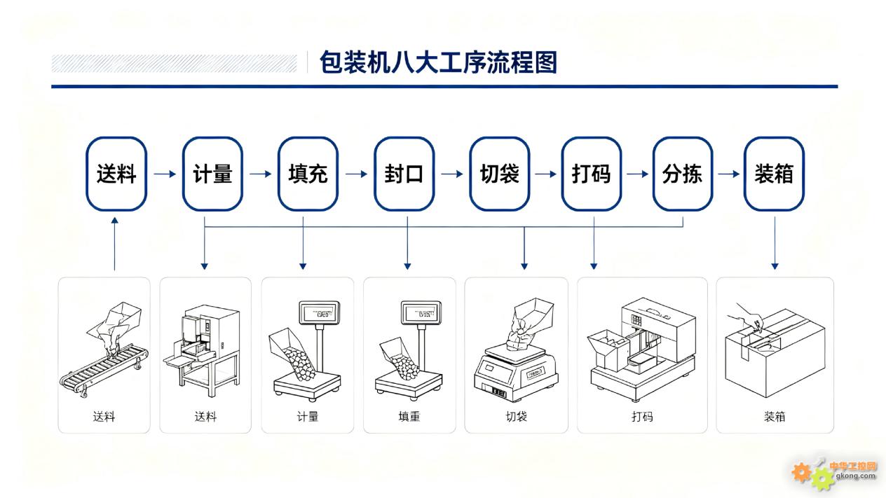 包装环节的特殊性在于:它涉及的动作最多——送料、计量、填充、封口、切袋、打码、分拣、装箱,每一步都要精准配合。