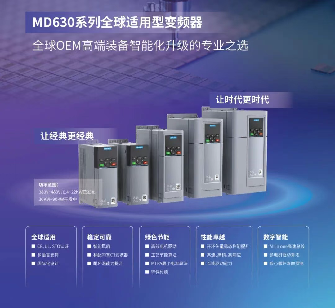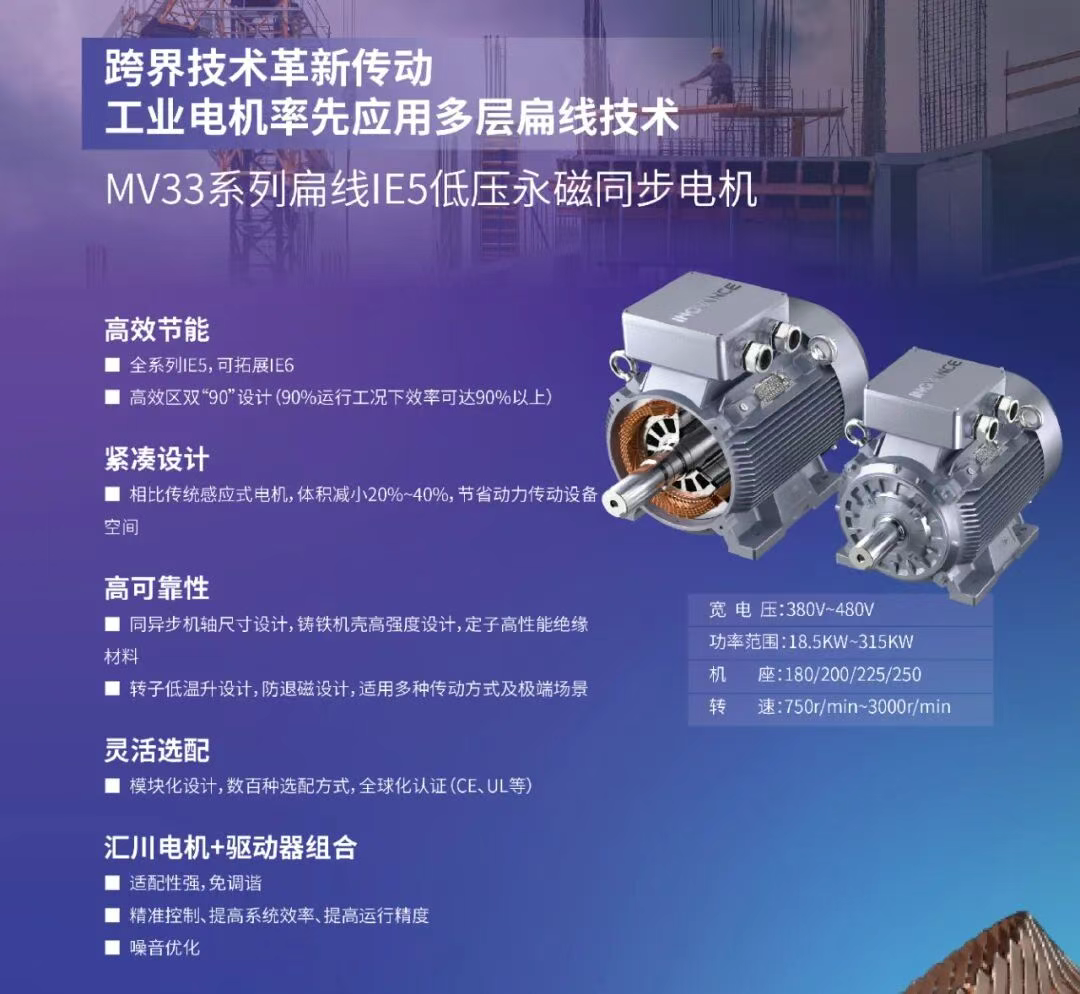 汇川技术MV3X系列低压工业永磁同步电机采用高性能永磁材料,额定效率达IE5能效标准,比传统异步电机提高5-10%。配合MD630系列低压矢量变频器,电机可在25%-120%的负载范围内保持高效运行;此外,系统融入了汇川智能节能算法,实时监测负载变化,自动优化运行参数,确保系统始终处于最佳能耗状态。