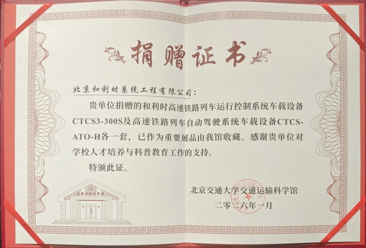 近日,为加强与北京交通大学的交流合作,共同推动轨道交通领域的科技创新与人才培养,和利时向“北京交通大学交通运输科学馆”(国家级科普教育基地)捐赠列控核心设备。此次捐赠的CTCS3-300S高速铁路列车运行控制系统车载设备及高速铁路列车自动驾驶系统车载设备CTCS-ATO-H,旨在将前沿列车运行控制技术转化为优质科普资源,构建人才培养体验新窗口。