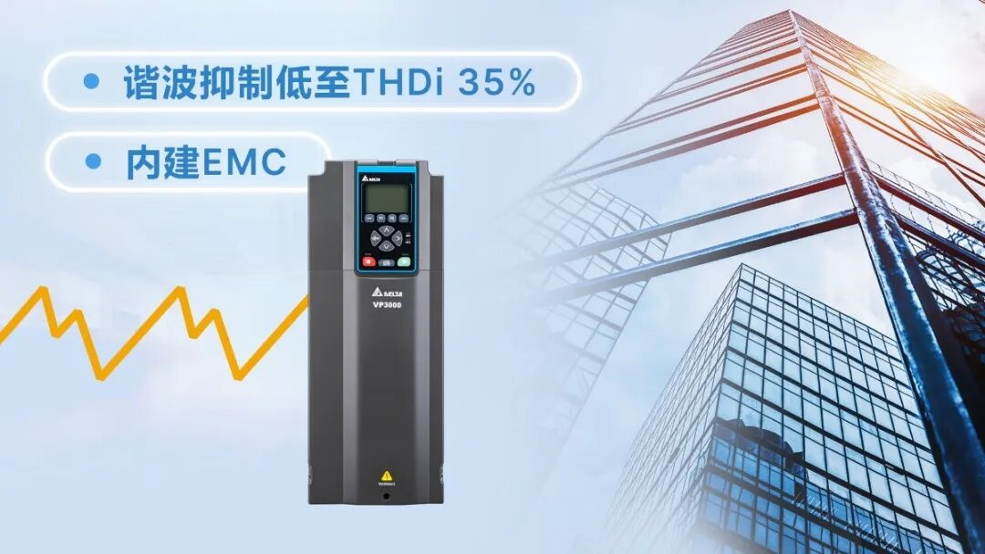 应用成效:台达流体通用变频器VP3000系列内置符合EMC C2标准的滤波器,从源头有效抑制电磁干扰;无需额外安装输入电抗器,谐波抑制低至 THDi 35 %,防电网波动能力更强。